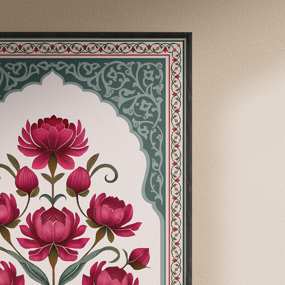 A unique interpretation of the traditional floral motif, Gulshan features peonies arranged within a Mughal-inspired arch, framed by flowing botanical details. Designed with rich rani pinks and muted jade tones, the piece evokes the quiet grandeur of palace gardens. East and West meet in a composition that feels both rooted and contemporary.